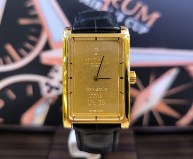 Винтажные, аристократические и вызывающие золотые часы CORUM 750 пробы с циферблатом из слитка банковского золота 999,9 пробы весом 15 грамм.