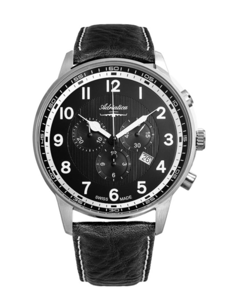 Корпус диаметром 46 мм выполнен из нержавеющей стали 316L. Часы кварцевые с хронографом. Стекло минеральное. Циферблат черного цвета. Метки и стрелки часов покрыты люминесцентным составом,что обеспечивает их свечение в темноте. Водозащита 50 метров. Черный кожаный ремень. Функции: часы, минуты, секунды, дата, хронограф.
