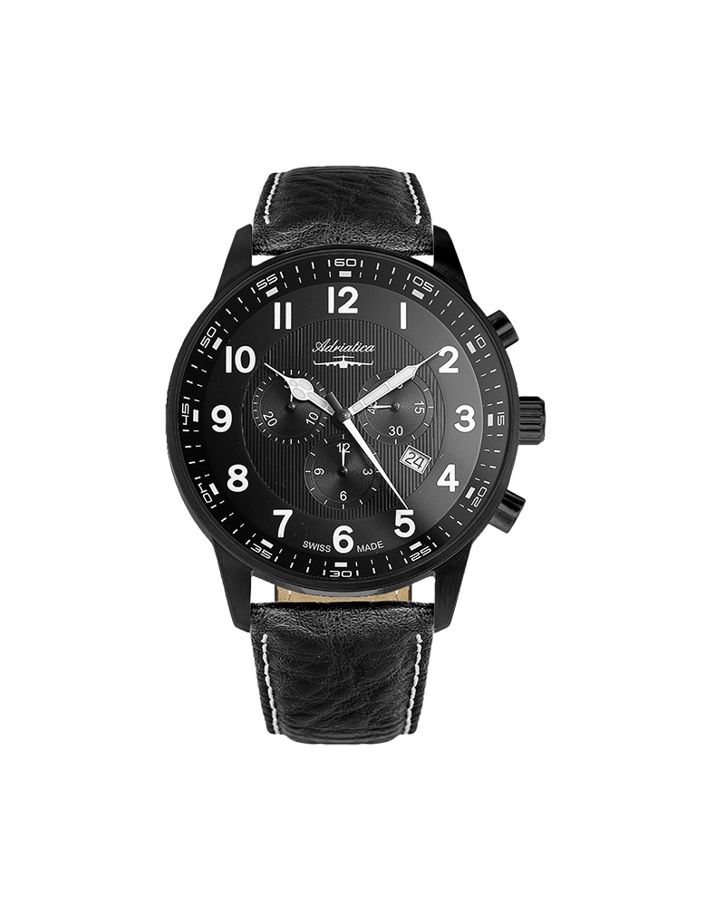 Корпус диаметром 46 мм выполнен из нержавеющей стали 316L с PVD-покрытием черного цвета. Часы кварцевые с хронографом. Стекло сапфировое. Циферблат черного цвета. Метки и стрелки часов покрыты люминесцентным составом,что обеспечивает их свечение в темноте. Водозащита 50 метров. Черный кожаный ремень. Функции: часы, минуты, секунды, дата, хронограф.