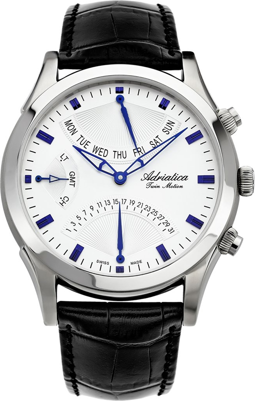 Корпус диаметром 44 мм выполнен из нержавеющей стали 316L. Часы кварцевые. Стекло сапфировое. Циферблат белого цвета. Водозащита 50 метров. Ремень из телячьей кожи. Функции: часы, минуты,дата, день недели.