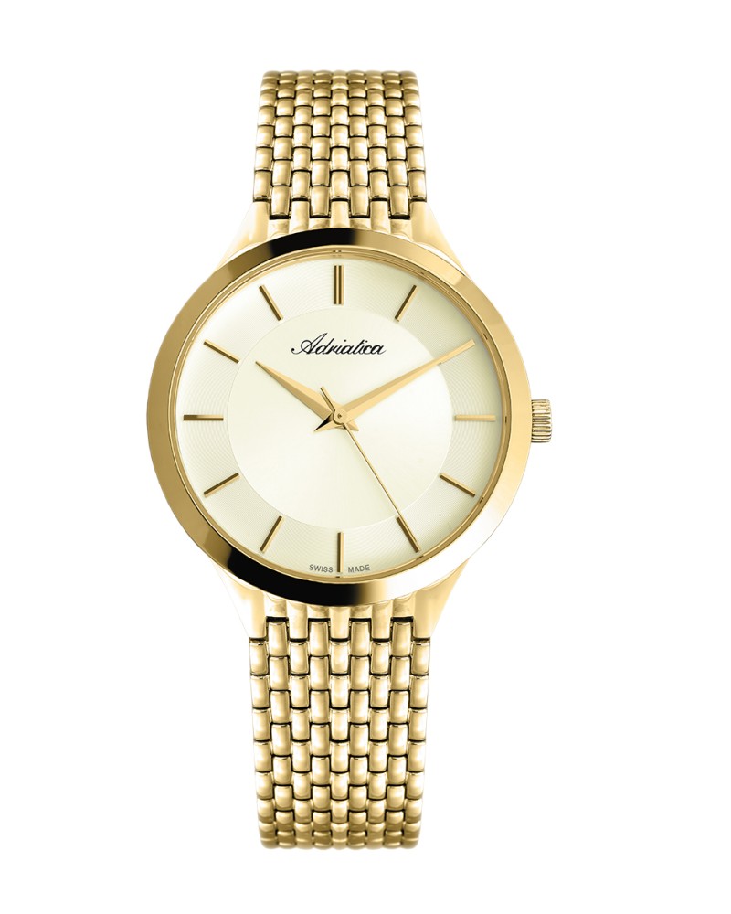 Корпус диаметром 39 мм и браслет выполнены из нержавеющей стали 316L с PVD-покрытием золотого цвета. Часы кварцевые. Стекло сапфировое. Циферблат с оттенком желтого золота. Водозащита 30 метров. Функции: часы, минуты, секунды.