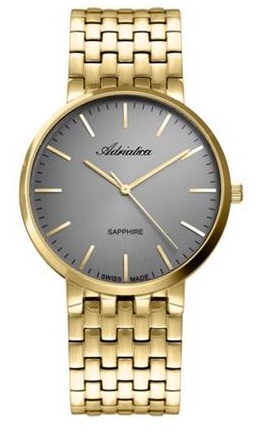 Корпус диаметром 40 мм и браслет выполнены из нержавеющей стали 316L с PVD-покрытием золотого цвета. Часы кварцевые. Стекло сапфировое. Циферблат серого цвета. Водозащита 50 метров. Функции: часы, минуты, секунды.