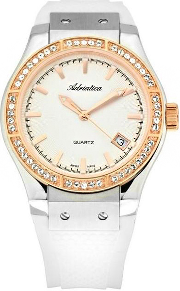 Корпус диаметром 38 мм выполнен из нержавеющей стали 316L. Безель стальной с PVD-покрытием золотого цвета и синтетическими камнями. Часы кварцевые. Стекло минеральное. Циферблат белого цвета. Водозащита 50 метров. Ремень каучуковый. Функции: часы, минуты, секунды, дата.