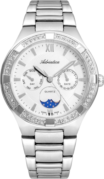 Корпус диаметром 38 мм и браслет выполнены из нержавеющей стали 316L .Часы кварцевые. Стекло минеральное. Россыпь синтетических камней вокруг стекла. Циферблат белого цвета. Водозащита 50 метров. Функции: часы, минуты, секунды, дата, день недели, индикация фаз Луны.
