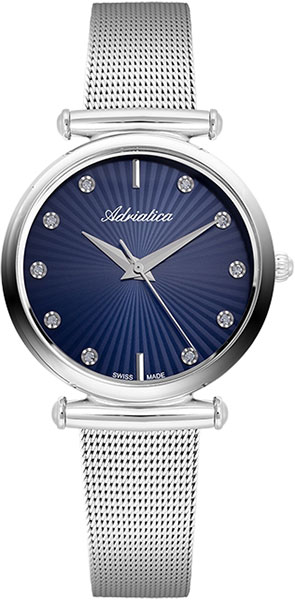 Корпус диаметром 33 мм и браслет миланского плетения выполнены из нержавеющей стали 316L. Часы кварцевые. Стекло минеральное. Синий циферблат с синтетическими камнями по меткам. Водозащита 30 метров. Функции: часы, минуты, секунды.