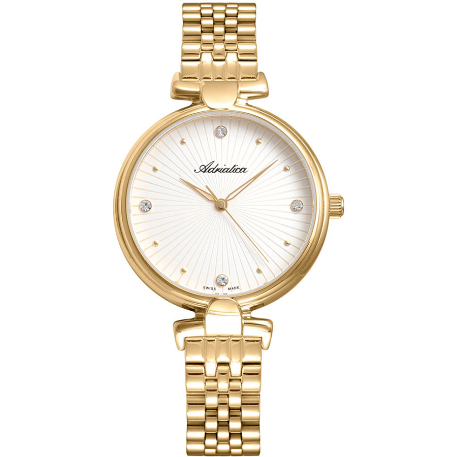 Корпус диаметром 35 мм и браслет выполнены из нержавеющей стали 316L с PVD-покрытием золотого цвета. Часы кварцевые. Стекло минеральное. Циферблат белого цвета. Водозащита 30 метров. Функции: часы, минуты, секунды.