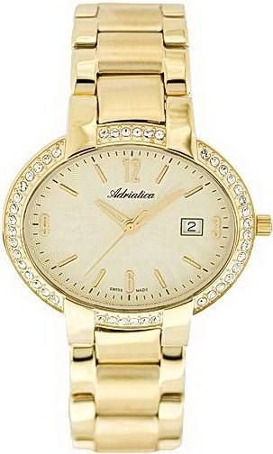 Овальный корпус размером 38 х 31 мм и браслет выполнены из нержавеющей стали 316L с PVD-покрытием золотого цвета. Часы кварцевые. Стекло минеральное закаленное. Вокруг стекла расположены синтетические камни. Циферблат золотого цвета. Водозащита 50 метров. Функции: часы, минуты, секунды,дата.