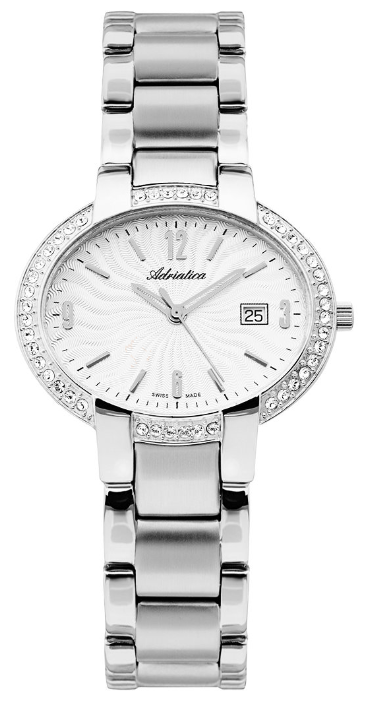 Овальный корпус размером 38 х 31 мм и браслет выполнены из нержавеющей стали 316L. Часы кварцевые. Стекло минеральное закаленное. Вокруг стекла расположены синтетические камни. Циферблат стального цвета. Водозащита 50 метров. Функции: часы, минуты, секунды,дата.