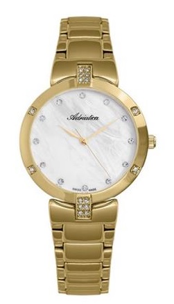 Корпус диаметром 35 мм и браслет выполнены из нержавеющей стали 316L с PVD-покрытием золотого цвета. Часы кварцевые. Стекло минеральное. Перламутровый белый циферблат с синтетическими камнями по меткам. Водозащита 30 метров. Функции: часы, минуты, секунды.