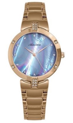 Корпус диаметром 35 мм и браслет выполнены из нержавеющей стали 316L с PVD-покрытием золотого цвета. Часы кварцевые. Стекло минеральное. Перламутровый серый циферблат с синтетическими камнями по меткам. Водозащита 30 метров. Функции: часы, минуты, секунды.