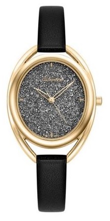 Овальный корпус размером 32x45 мм выполнен из нержавеющей стали 316L с PVD-покрытием золотого цвета. Часы кварцевые. Стекло минеральное. Блестящий циферблат серого цвета. Черный кожаный ремень. Водозащита 30 метров. Функции: часы, минуты, секунды.