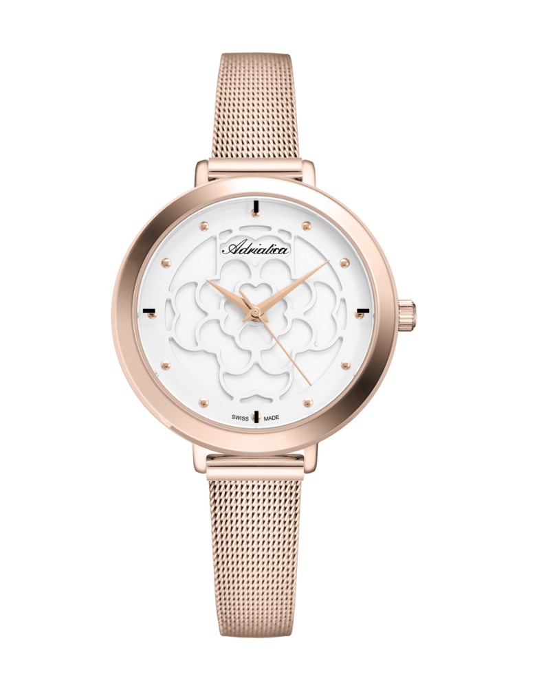 Корпус диаметром 36 мм и браслет миланского плетения выполнены из нержавеющей стали 316L с PVD-покрытием золотого цвета. Часы кварцевые. Стекло минеральное. Белый циферблат с флористическим узором. Водозащита 30 метров. Функции: часы, минуты, секунды.