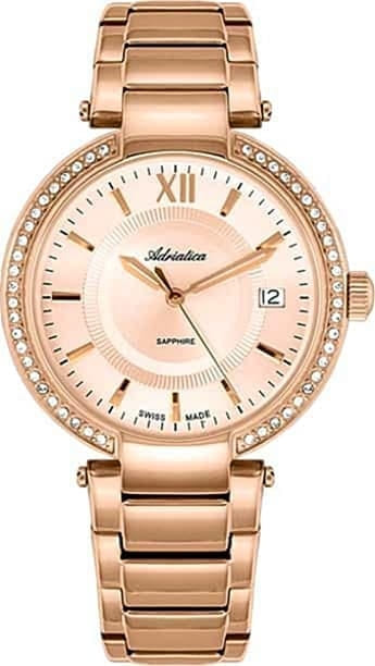 Корпус диаметром 38 мм и браслет выполнены из нержавеющей стали 316L с PVD-покрытием золотого цвета. Часы кварцевые. Стекло сапфировое. Циферблат бежевого цвета. Водозащита 30 метров. Функции: часы, минуты, секунды, дата.