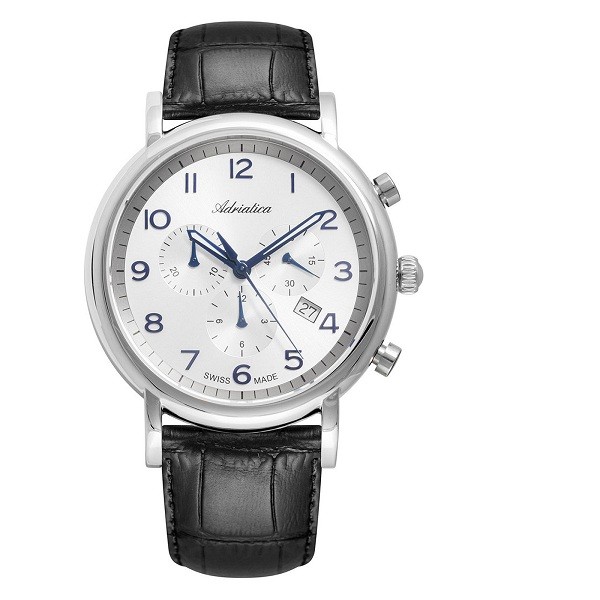 Корпус диаметром 42 мм выполнен из нержавеющей стали 316L. Часы кварцевые с хронографом. Стекло сапфировое. Циферблат белого цвета. Водозащита 50 метров. Черный кожаный ремень. Функции: часы, минуты, секунды, дата, хронограф.