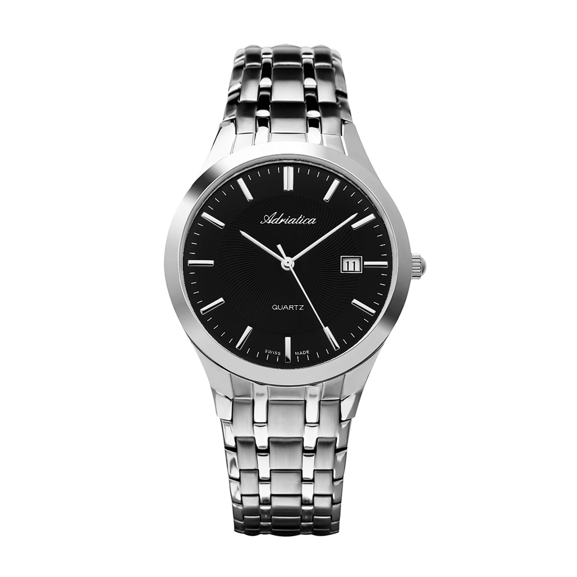Корпус диаметром 40 мм и браслет выполнены из нержавеющей стали 316L. Часы кварцевые. Стекло сапфировое. Черный циферблат. Водозащита 50 метров. Функции: часы, минуты, секунды, дата.