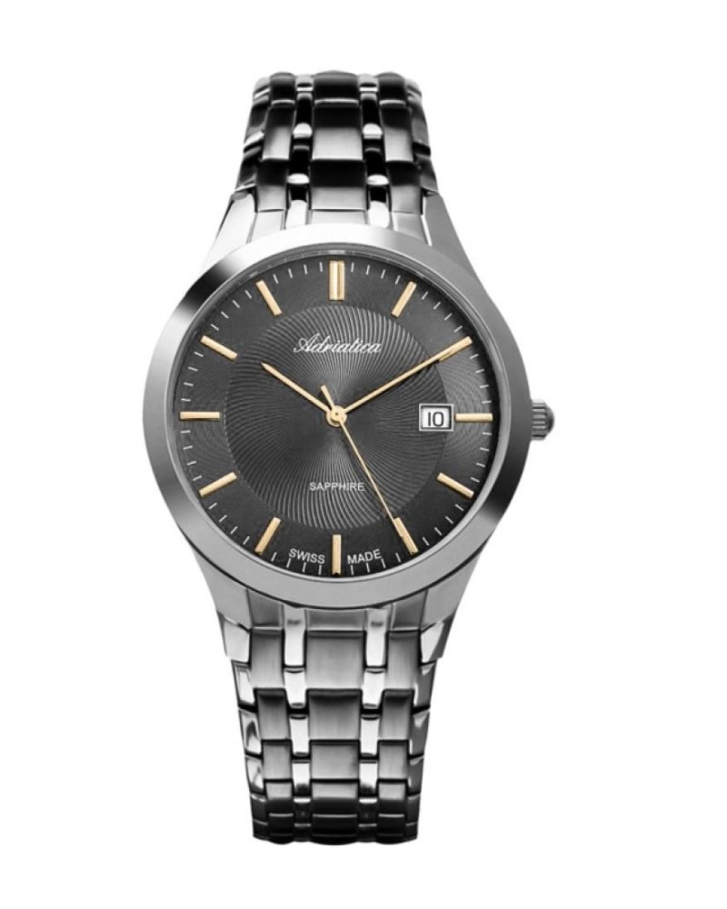 Корпус диаметром 40 мм и браслет выполнены из нержавеющей стали 316L с серым PVD-покрытием. Часы кварцевые. Стекло сапфировое. Серый циферблат. Водозащита 50 метров. Функции: часы, минуты, секунды, дата.
