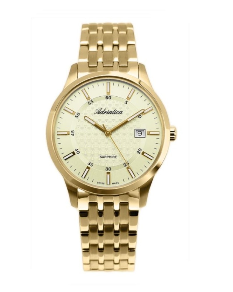 Корпус диаметром 40 мм и браслет выполнены из нержавеющей стали 316L с PVD-покрытием золотого цвета. Часы кварцевые. Стекло сапфировое. Циферблат кремового цвета. Стрелки и метки часов покрыты люминесцентным составом, что обеспечивает их свечение в темноте.Водозащита 50 метров. Функции: часы, минуты, секунды, дата.