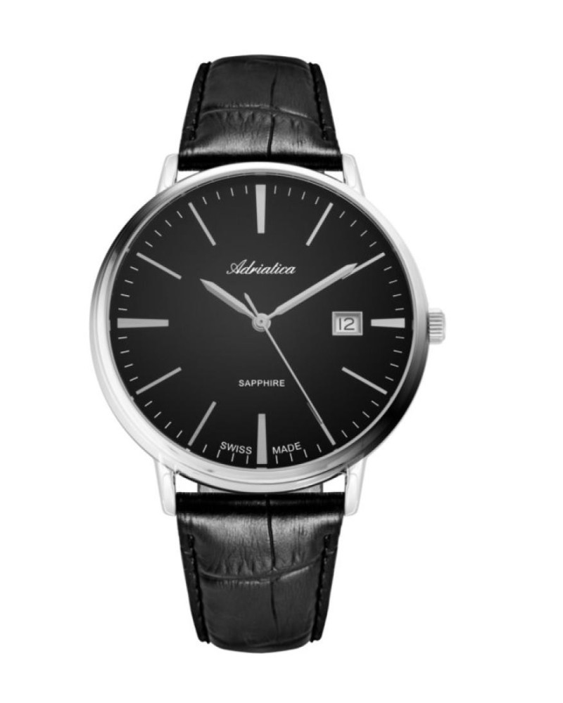 Корпус диаметром 40 мм выполнен из нержавеющей стали 316L. Часы кварцевые. Стекло сапфировое. Черный циферблат. Водозащита 50 метров. Черный кожаный ремень. Функции: часы, минуты, секунды, дата.