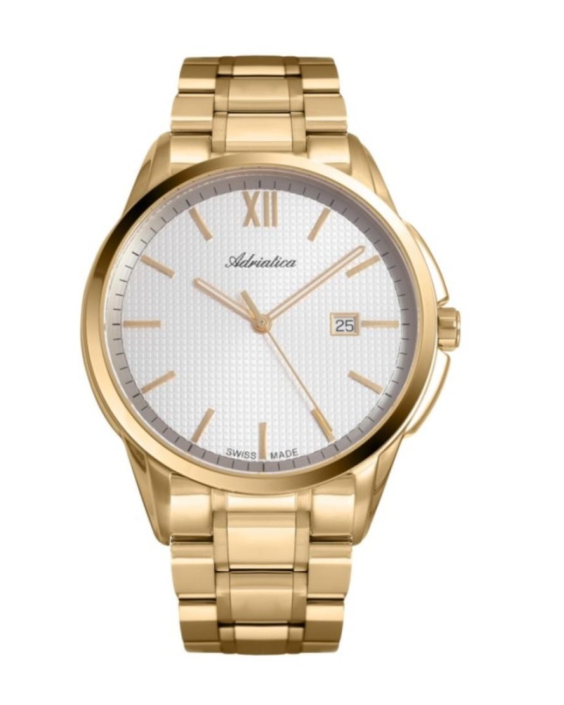 Корпус диаметром 45 мм и браслет выполнены из нержавеющей стали 316L с PVD-покрытием золотого цвета. Часы кварцевые. Стекло сапфировое. Циферблат серебристого цвета. Стрелки часов покрыты люминесцентным составом, что обеспечивает их свечение в темноте. Водозащита 50 метров. Функции: часы, минуты, секунды, дата.