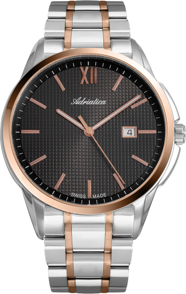Корпус диаметром 45 мм и браслет выполнены из нержавеющей стали 316L с элементами с PVD-покрытием золотого цвета. Часы кварцевые. Стекло сапфировое. Циферблат серого цвета. Стрелки часов покрыты люминесцентным составом,что обеспечивает их свечение в темноте. Водозащита 50 метров. Функции: часы, минуты, секунды, дата.
