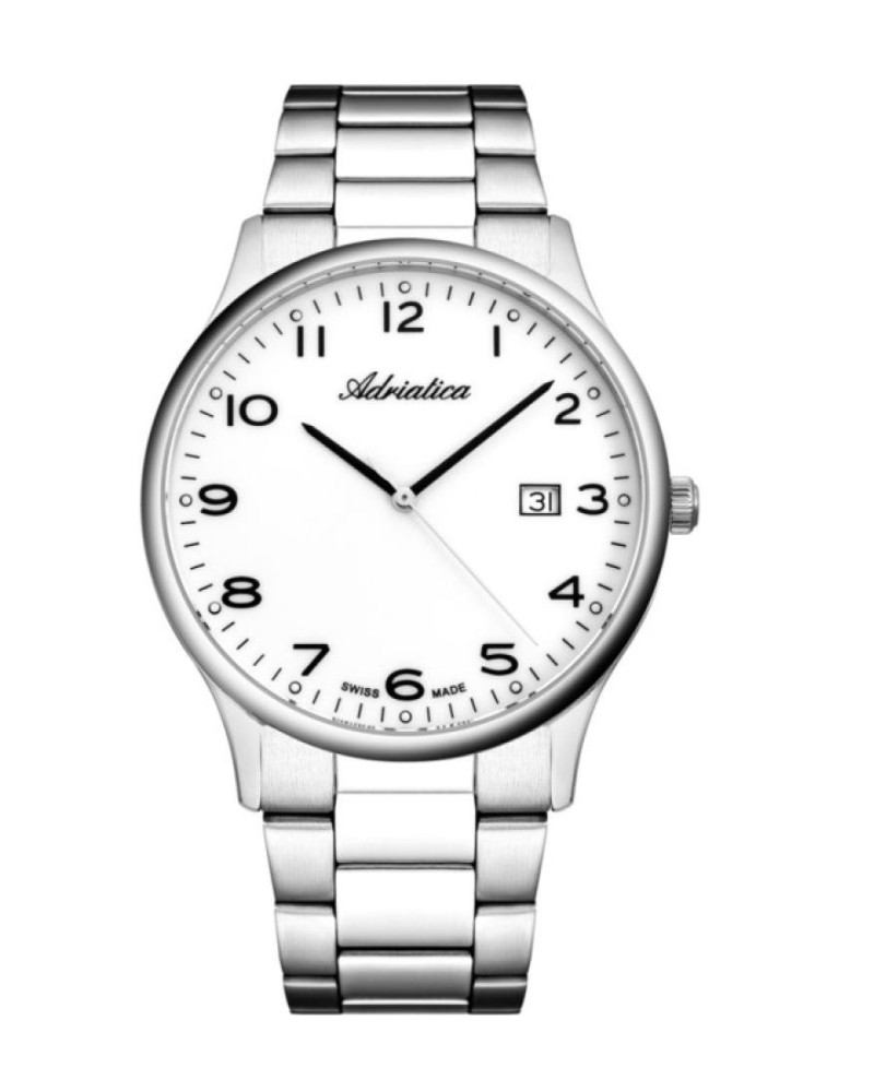 Корпус диаметром 41 мм и браслет выполнены из нержавеющей стали 316L. Часы кварцевые. Стекло сапфировое. Циферблат белого цвета. Водозащита 30 метров. Функции: часы, минуты, секунды, дата.