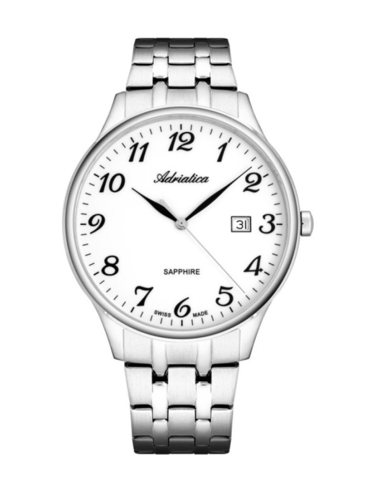 Корпус диаметром 41 мм и браслет выполнены из нержавеющей стали 316L. Часы кварцевые. Стекло сапфировое. Циферблат белого цвета. Водозащита 50 метров. Функции: часы, минуты, секунды, дата.