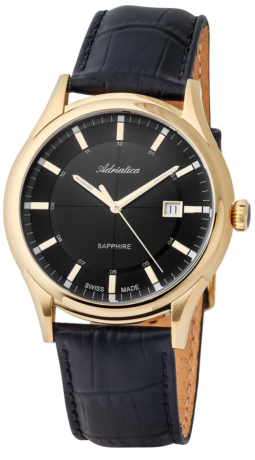 Корпус диаметром 42 мм выполнен из нержавеющей стали 316L с PVD-покрытием золотого цвета. Часы кварцевые. Стекло сапфировое. Циферблат черного цвета. Стрелки и метки часов покрыты люминесцентным составом,что обеспечивает их свечение в темноте. Черный кожаный ремень. Водозащита 50 метров. Функции: часы, минуты, секунды, дата.