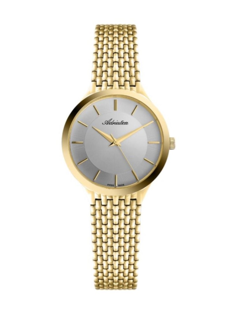 Корпус диаметром 28 мм и браслет выполнены из нержавеющей стали 316L с PVD-покрытием золотого цвета. Часы кварцевые. Стекло сапфировое. Циферблат серого цвета. Водозащита 30 метров. Функции: часы, минуты, секунды.