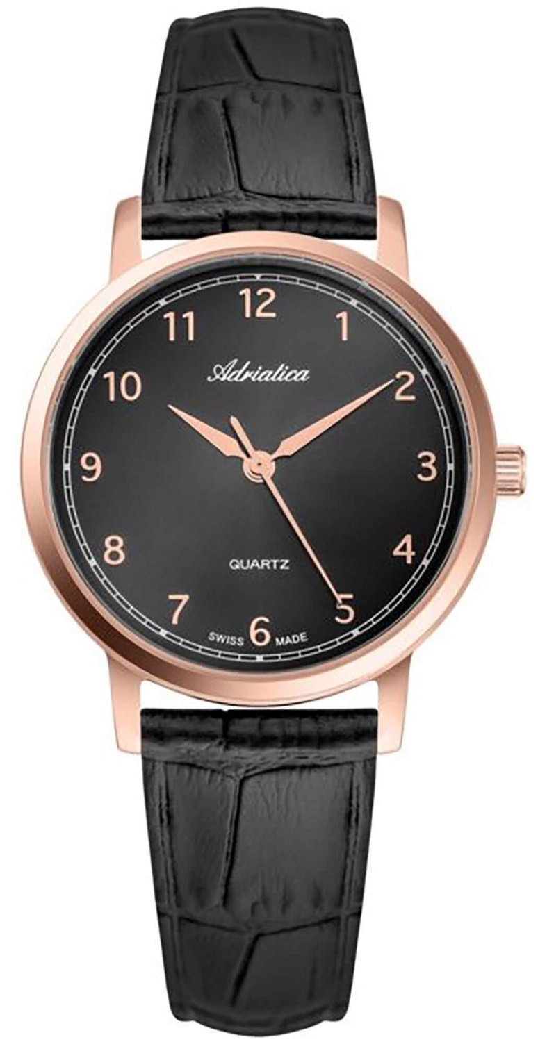 Корпус диаметром 33 мм выполнен из нержавеющей стали 316L с PVD-покрытием золотого цвета. Часы кварцевые. Стекло минеральное. Циферблат черного цвета. Черный кожаный ремень. Водозащита 50 метров. Функции: часы, минуты, секунды.
