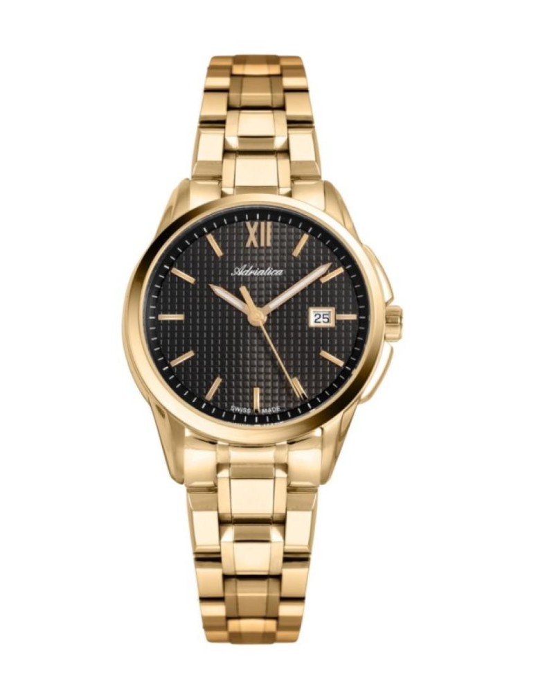 Корпус диаметром 33 мм и браслет выполнены из нержавеющей стали 316L с PVD-покрытием золотого цвета. Часы кварцевые. Стекло сапфировое. Циферблат графитового цвета. Стрелки часов покрыты люминесцентным составом, что обеспечивает их свечение в темноте. Водозащита 50 метров. Функции: часы, минуты, секунды, дата.