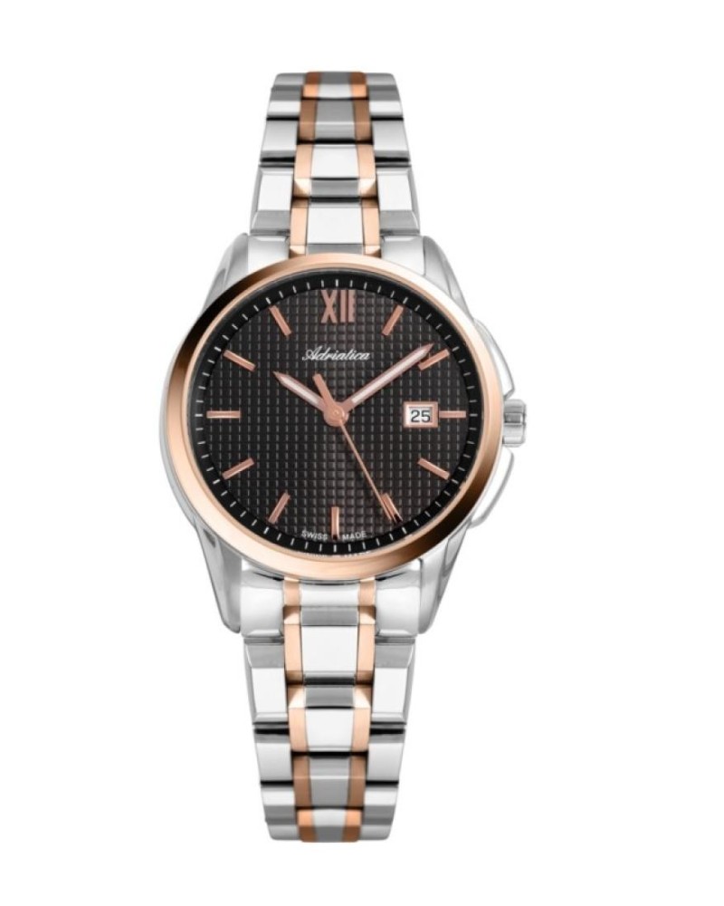 Корпус диаметром 33 мм и браслет выполнены из нержавеющей стали 316L с элементами с PVD-покрытием золотого цвета. Часы кварцевые. Стекло сапфировое. Циферблат графитового цвета. Стрелки часов покрыты люминесцентным составом, что обеспечивает их свечение в темноте. Водозащита 50 метров. Функции: часы, минуты, секунды, дата.