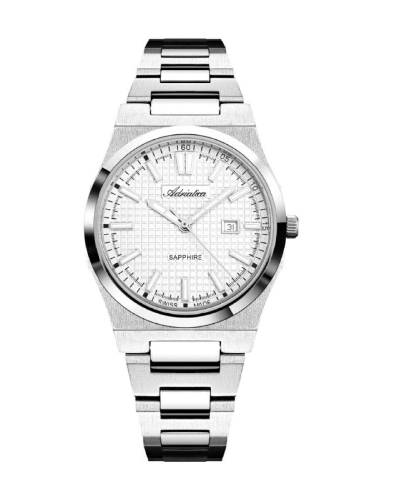 Корпус диаметром 34 мм и браслет выполнены из нержавеющей стали 316L. Часы кварцевые. Стекло сапфировое. Метки и стрелки часов покрыты люминесцентным составом, что обеспечивает их свечение в темноте. Циферблат серебристого цвета. Водозащита 50 метров. Функции: часы, минуты, секунды, дата.