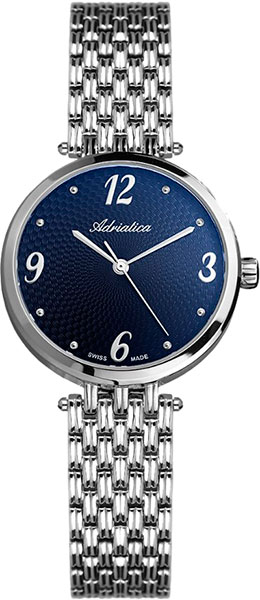 Корпус размером 21х23 мм и браслет выполнены из нержавеющей стали 316L. Часы кварцевые. Стекло минеральное. Циферблат синего цвета. Водозащита 30 метров. Функции: часы, минуты, секунды.