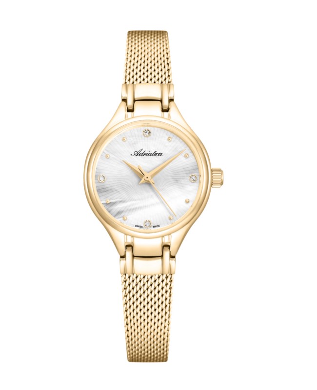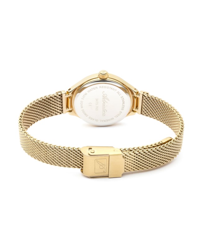 Корпус диаметром 26 мм и браслет миланского плетения выполнены из нержавеющей стали 316L с PVD-покрытием золотого цвета. Часы кварцевые. Стекло минеральное. Белый перламутровый циферблат. Водозащита 30 метров. Функции: часы, минуты, секунды.