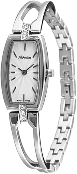 Корпус размером 17 х 29 мм и браслет выполнены из нержавеющей стали 316L. Часы кварцевые. Стекло минеральное. Перламутровый циферблат белого цвета. Водозащита 30 метров. Функции: часы, минуты.