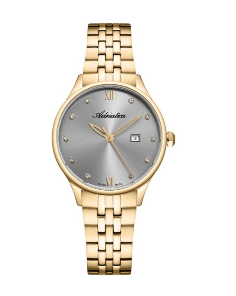Корпус диаметром 34 мм и браслет выполнены из нержавеющей стали 316L с PVD-покрытием золотого цвета. Часы кварцевые. Стекло минеральное. Циферблат серого цвета. Часовые метки украшены синтетическими камнями. Водозащита 30 метров. Функции: часы, минуты, секунды, дата.
