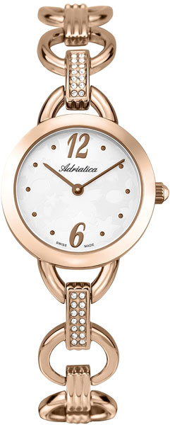 Корпус диаметром 28 мм и браслет выполнены из нержавеющей стали 316L с PVD-покрытием золотого цвета. Часы кварцевые. Стекло минеральное. Циферблат серебристого цвета. Водозащита 30 метров. Функции: часы, минуты.