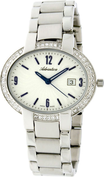 Овальный корпус размером 38 х 31 мм и браслет выполнены из нержавеющей стали 316L. Часы кварцевые. Стекло минеральное. Вокруг стекла расположены синтетические камни. Циферблат серебряного цвета. Водозащита 50 метров. Функции: часы, минуты, секунды,дата.