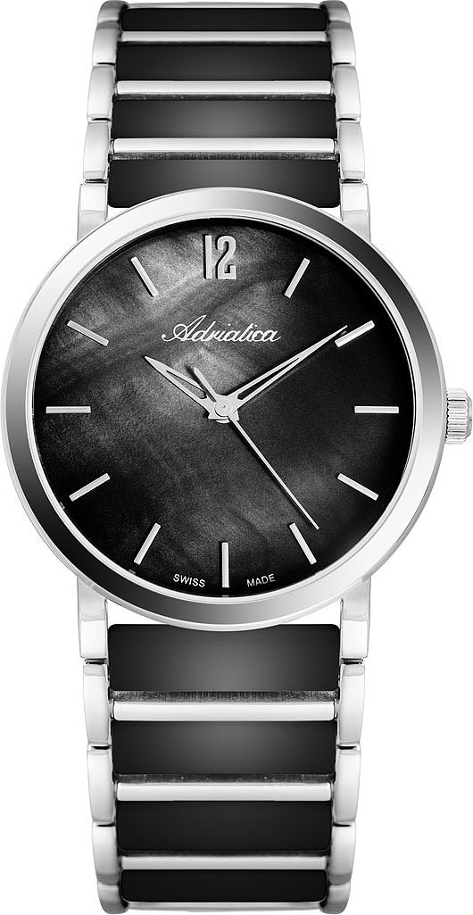 Корпус диаметром 36 мм выполнен из нержавеющей стали 316L. Браслет с черными керамическими вставками выполнен из нержавеющей стали 316L. Часы кварцевые. Стекло минеральное. Перламутровый черный циферблат. Водозащита 30 метров. Функции: часы, минуты, секунды.