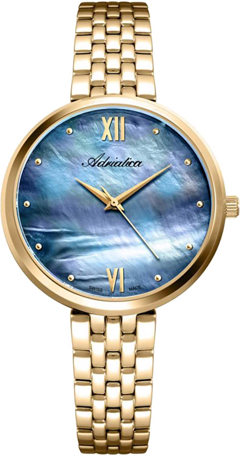 Корпус диаметром 36 мм и браслет выполнены из нержавеющей стали 316L с PVD-покрытием золотого цвета. Часы кварцевые. Стекло минеральное. Перламутровый серый циферблат. Водозащита 30 метров. Функции: часы, минуты, секунды.