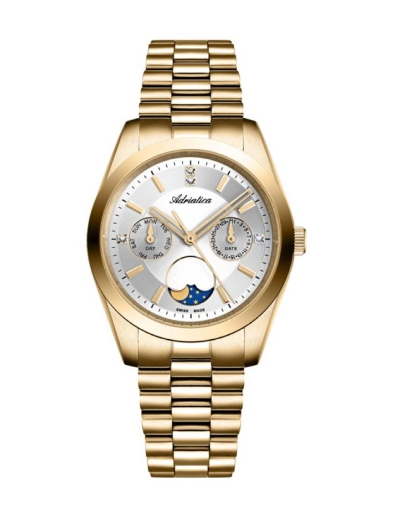 Корпус диаметром 35 мм и браслет выполнены из нержавеющей стали 316L с PVD-покрытием золотого цвета. Часы кварцевые. Стекло минеральное. Циферблат серебристого цвета. Водозащита 50 метров. Функции: часы, минуты, секунды, дата, день недели, индикация фаз Луны.