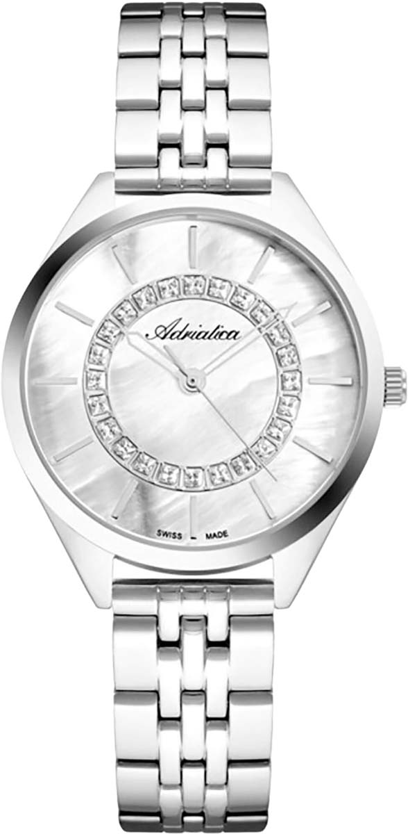 Корпус диаметром 34 мм и браслет выполнены из нержавеющей стали 316L. Часы кварцевые. Стекло минеральное. Серый перламутровый циферблат с россыпью синтетических камней. Водозащита 30 метров. Функции: часы, минуты, секунды.