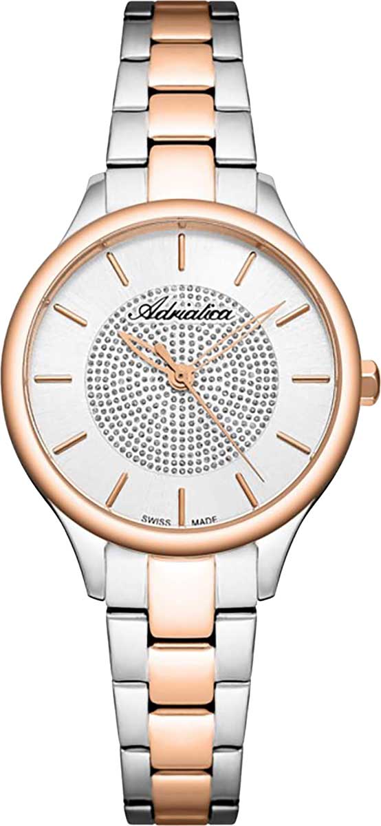 Корпус диаметром 34 мм и браслет выполнены из нержавеющей стали 316L с элементами с PVD-покрытием золотого цвета. Часы кварцевые. Стекло минеральное. Циферблат серебристого цвета. Водозащита 30 метров. Функции: часы, минуты, секунды.