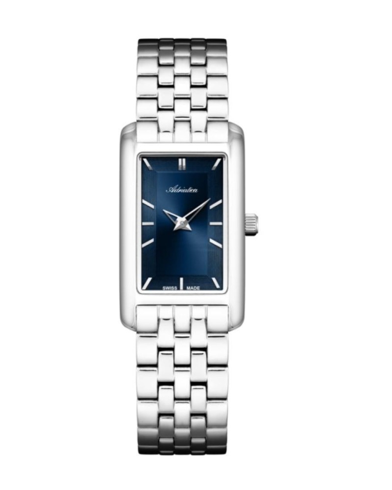 Корпус размером 37 x 22 мм и браслет выполнены из нержавеющей стали 316L. Часы кварцевые. Стекло минеральное. Циферблат синего цвета. Водозащита 30 метров. Функции: часы, минуты.