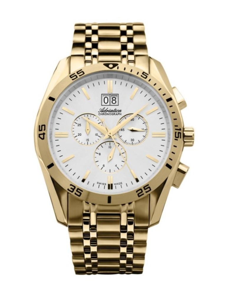 Корпус диаметром 45 мм и браслет выполнены из нержавеющей стали 316L с PVD-покрытием золотого цвета. Часы кварцевые с хронографом. Стекло сапфировое. Циферблат серебристого цвета. Водозащита 100 метров. Функции: часы, минуты, секунды, дата, хронограф.