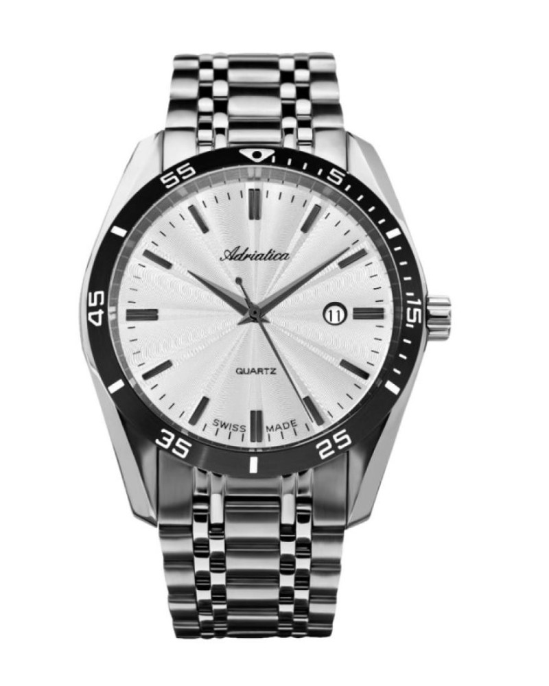Корпус диаметром 45 мм и браслет выполнены из нержавеющей стали 316L. Часы кварцевые. Стекло сапфировое. Циферблат серебристого цвета. Водозащита 100 метров. Функции: часы, минуты, секунды, дата.