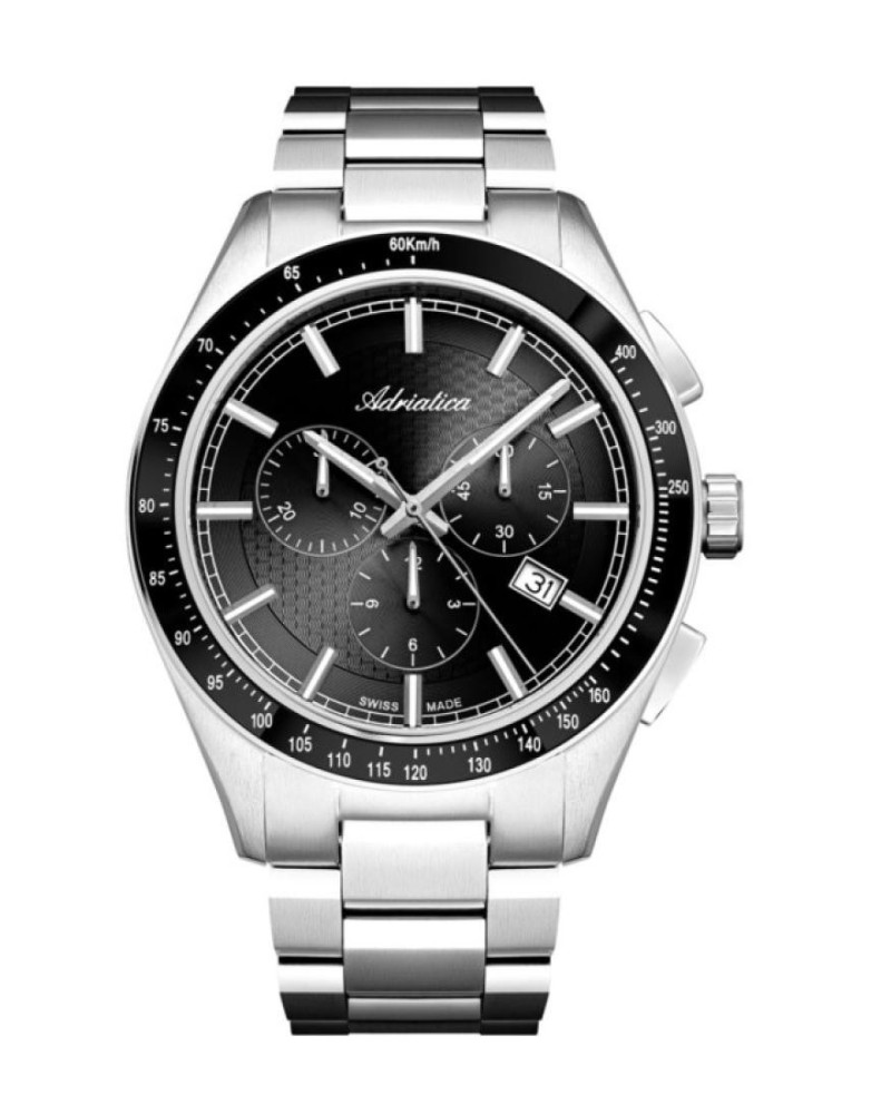Корпус диаметром 43 мм и браслет выполнены из нержавеющей стали 316L. Часы кварцевые с хронографом. Стекло сапфировое. Циферблат черного цвета. Водозащита 50 метров. Функции: часы, минуты, секунды, дата, хронограф.