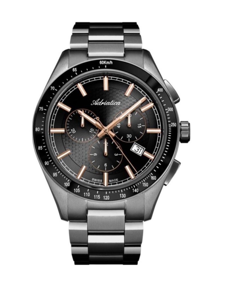 Корпус диаметром 43 мм и браслет выполнены из нержавеющей стали 316L с PVD-покрытием серого цвета. Часы кварцевые с хронографом. Стекло сапфировое. Циферблат черного цвета. Водозащита 50 метров. Функции: часы, минуты, секунды, дата, хронограф.