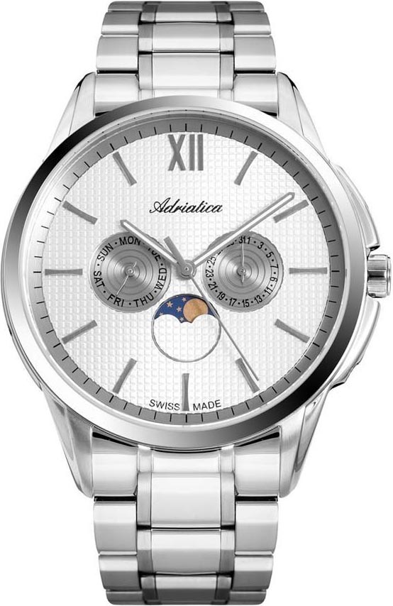 Корпус диаметром 45 мм и браслет выполнены из нержавеющей стали 316L. Часы кварцевые. Стекло сапфировое. Циферблат серебристого цвета. Водозащита 50 метров. Функции: часы, минуты, секунды, дата, день недели, индикация фаз Луны.