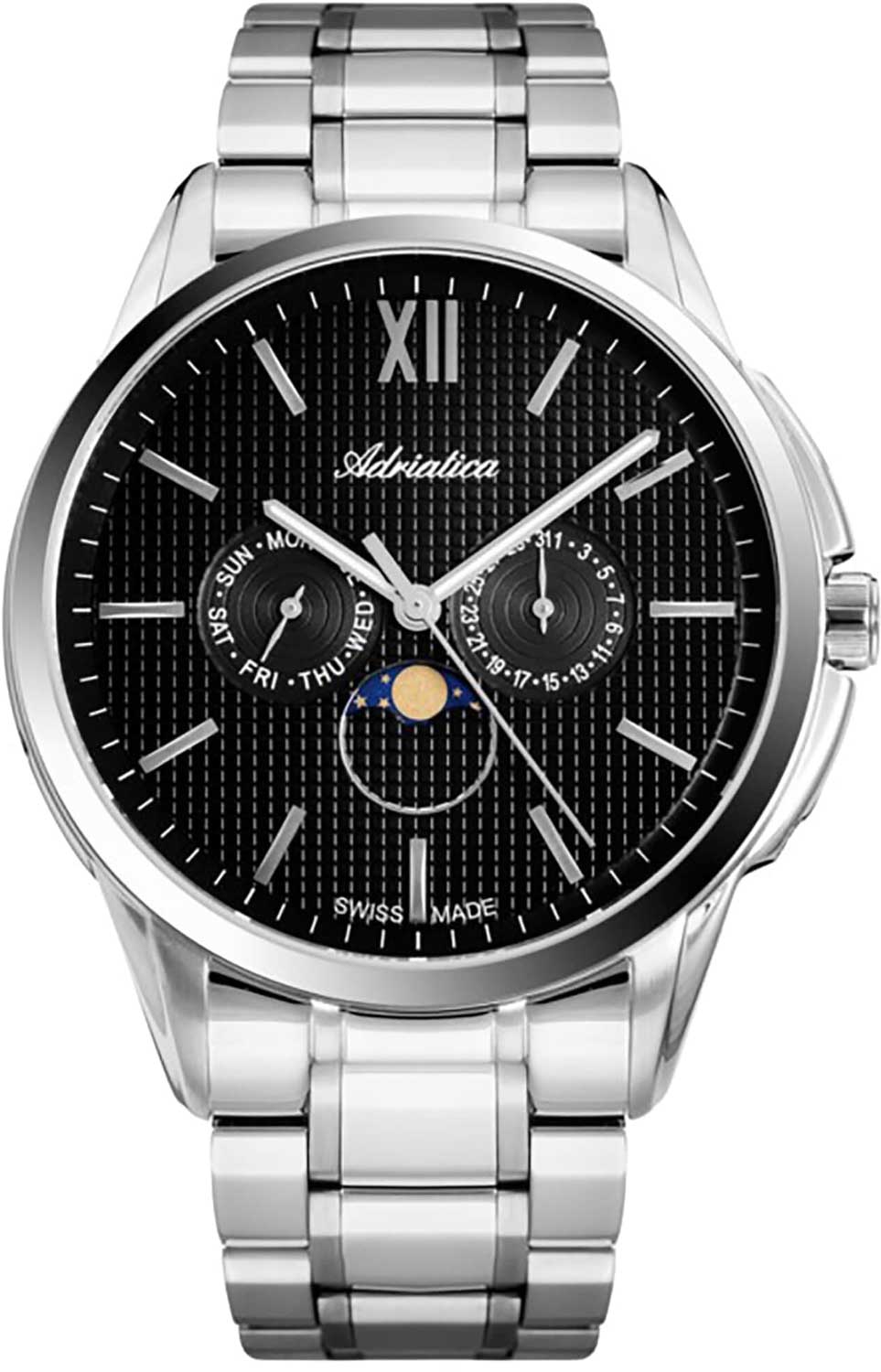 Корпус диаметром 45 мм и браслет выполнены из нержавеющей стали 316L. Часы кварцевые. Стекло сапфировое. Циферблат черного цвета. Водозащита 50 метров. Функции: часы, минуты, секунды, дата, день недели, индикация фаз Луны.
